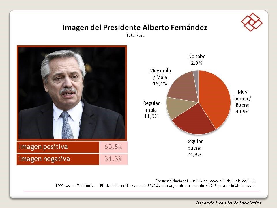 La imagen positiva del presidente Alberto Fernández es de 65,8 % y su imagen negativa es de 31,3 % para el mes de junio 2020.