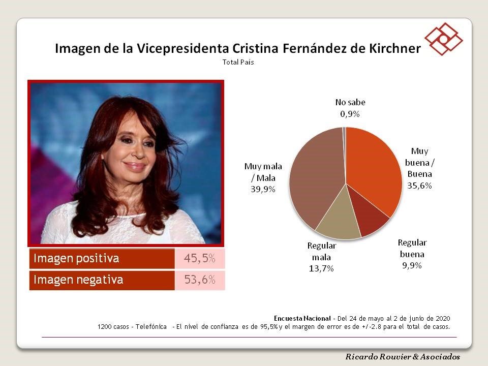 La imagen positiva de la vicepresidente Cristina Fernández es de 45,5 % y su imagen negativa de 53,6 % para el mes de junio 2020.