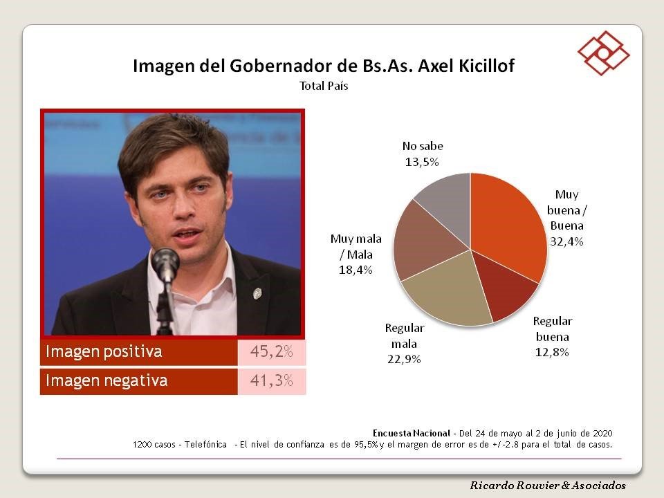 La imagen positiva del gobernador de la Provincia de Buenos Aires es de 45,5 % y la imagen negativa es de 53,6 % para el mes de junio 2020.