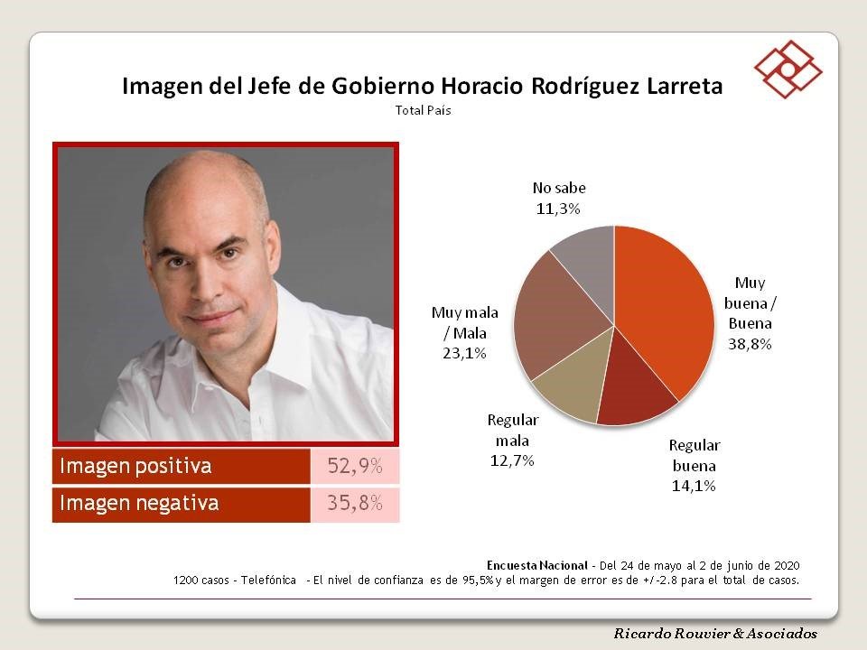 La imagen positiva del jefe de Gobierno de la Ciudad de Buenos Aires es 52,9 % y la imagen negativa 35,8 % para el mes de junio 2020.