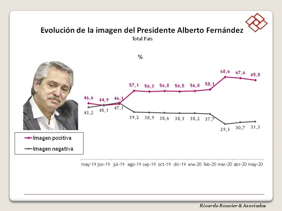 La evolución de la imagen de Alberto Fernández encuentra los siguientes puntos en mayo de 2019 de 46,6 %, en agosto de 19 fue de 57.1 %, en marzo 2020 encuentra un pico de su imagen de 68, 6% y en mayo 2020 es de 65,8%.