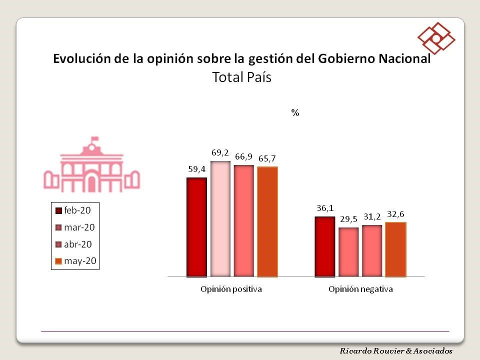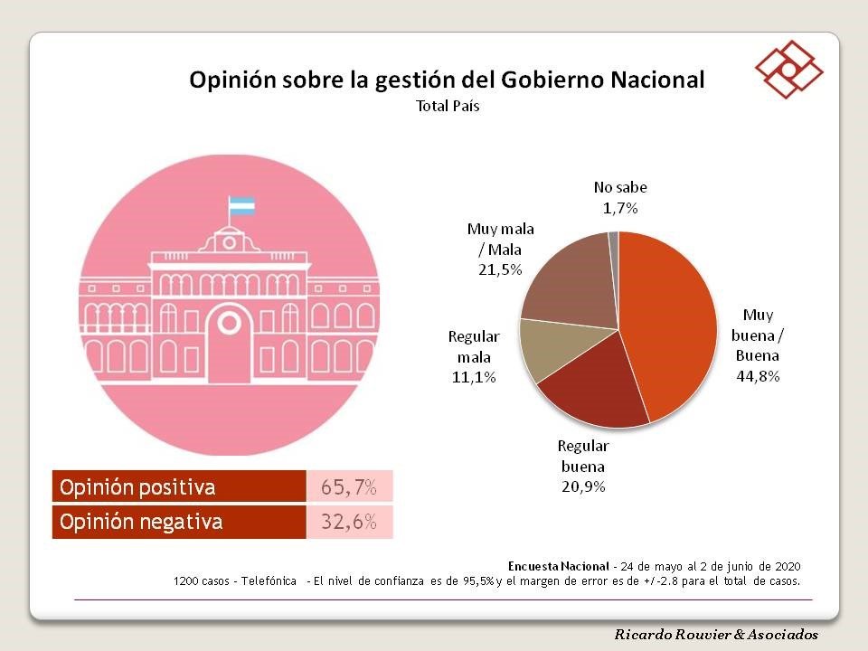 Preguntada la población nacional argentina sobre su opinión de la gestión del gobierno nacional, el 65,7 % piensa que es positiva y un 32,6 % que es negativa.