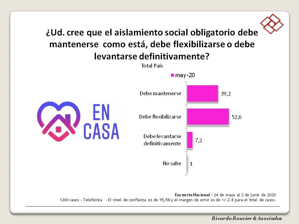 Ricardo Rouvier, analista político, afirma: “la cuarentena erosiona lentamente la popularidad del Presidente, comenzando a sentirse los efectos emocionales y el agravamiento de la situación económica. Hay una presión silenciosa de amplios sectores de la población que pugnan por volver a la normalidad”.